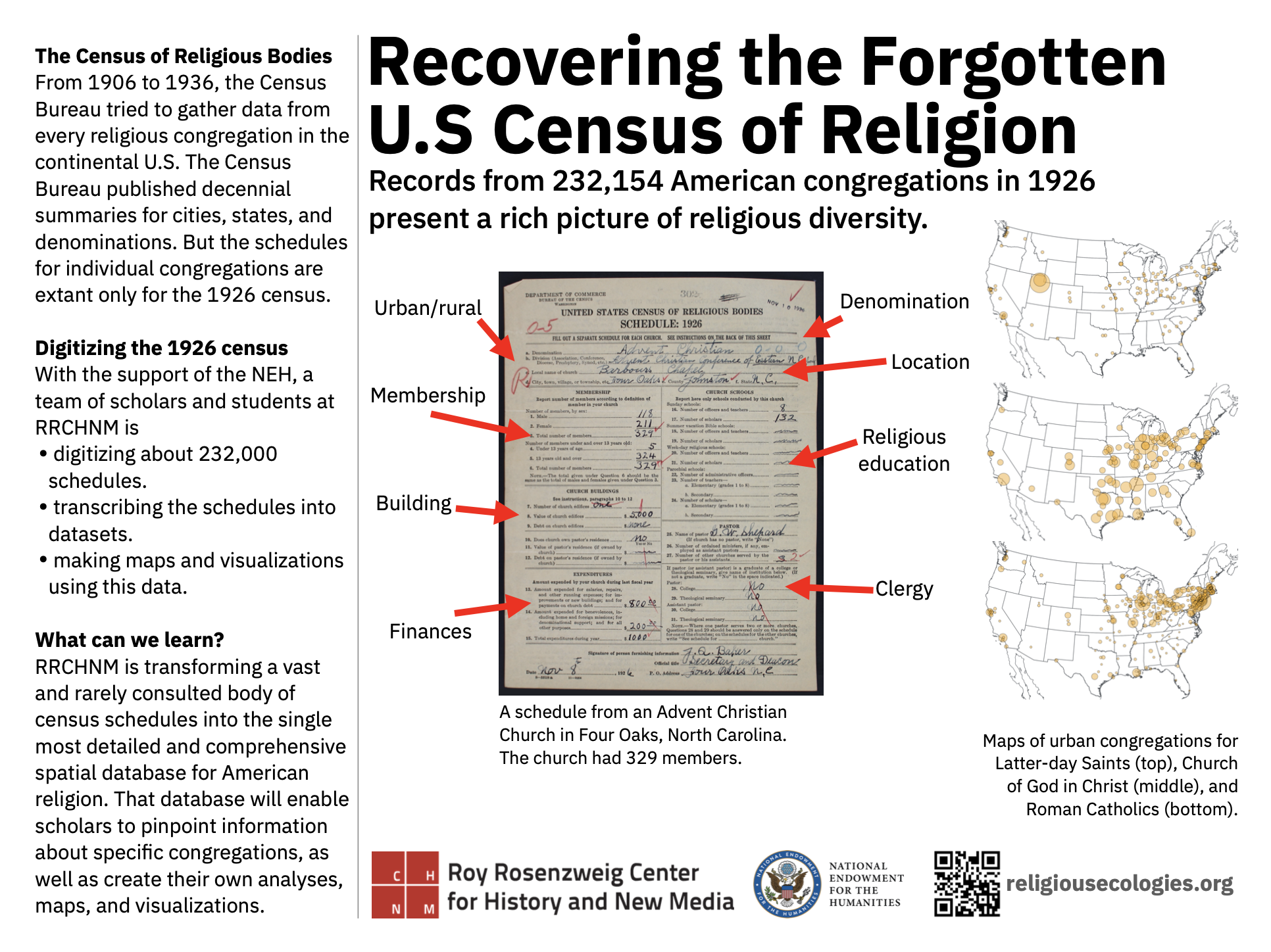 For the 2023 annual meeting of the American Historical Association, a large contingent from RRCHNM presented papers or posters. That included some of the American Religious Ecologies project team, who presented a poster about our project and zealously handed out materials about the project to passersby (which included a few of our advisory board members).