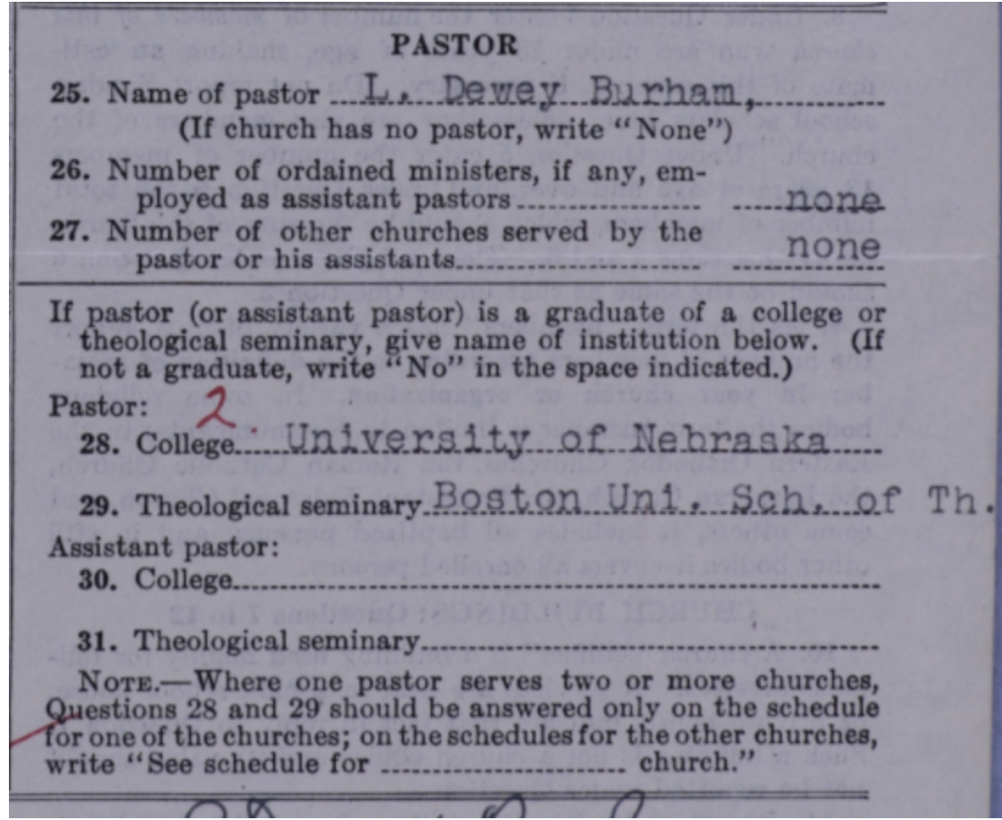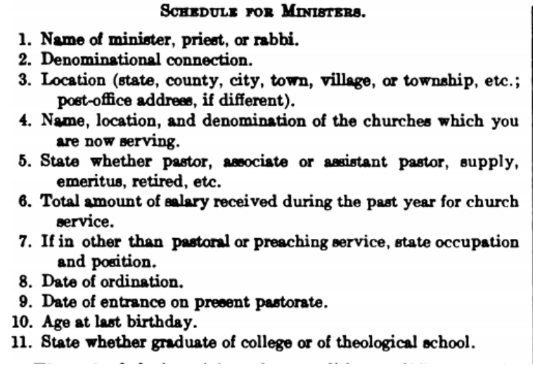 The 1916 Census explicitly asked for the name of the "minister, priest, or rabbi" who led the congregation, any other churches they served, their salary, if they had any other occupation, date of ordination, age, and if they graduated from college or theological school.