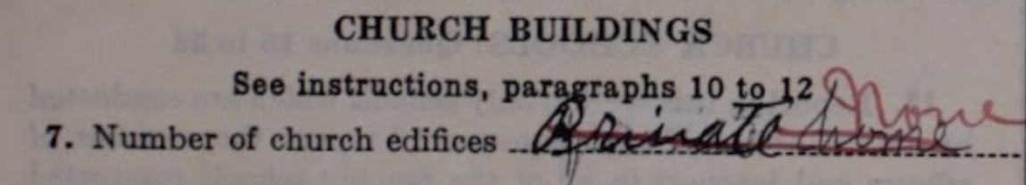 Brown’s church met at her home. On the Census Schedule, the field that asks about the number of church edifices reads “private home,” in black ink. However, the Census Bureau ‘corrected’ this by scratching it out and writing ‘None’ over it in red ink. As the church did not meet in a specific church-only space, the Bureau considered them to have no church edifice. The Dorcas Spiritual Alliance Church had eight members, all of whom were over the age of thirteen years old—and all were women. If the church was located at Brown’s home, her boarder, Ike Jenkins, was not a member.